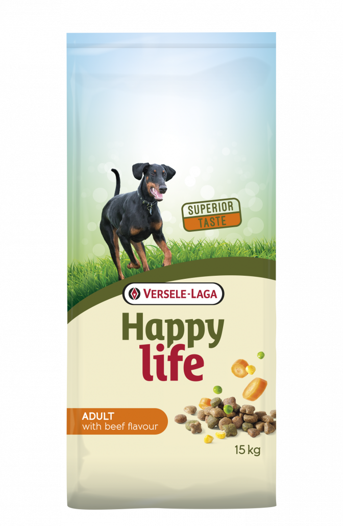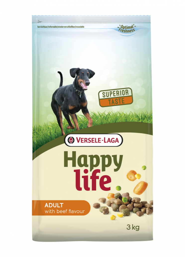 Happy life Adult со вкусом говядины — это вкусный и разнообразный корм, который обеспечивает всеми питательными элементами энергичных взрослых собак.